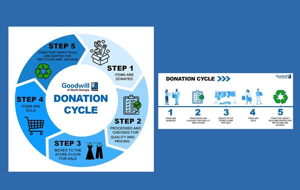I designed several options to revamp the sustainability efforts section on the Goodwill of North Georgia homepage. Our goal was to display the donation cycle to customers in this section.